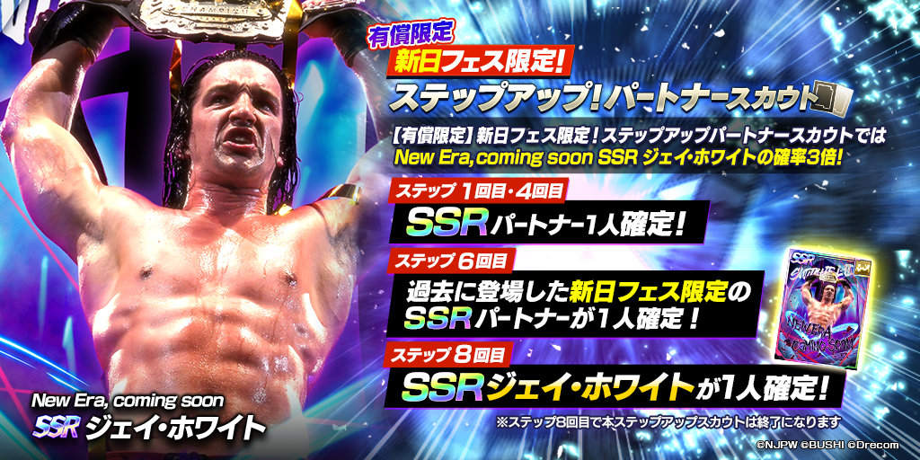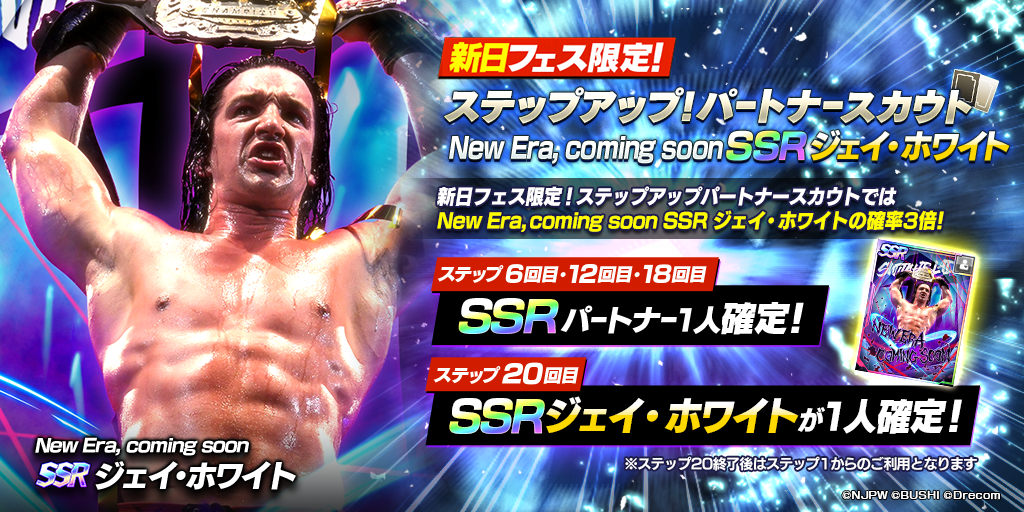 また、初登場となるフェス限定新SSRパートナー「[New Era,coming soon]ジェイ・ホワイト」は、ピックアップ対象パートナーとして、ステップアップ回数に関わらずスカウト確率が通常の3倍となっております。