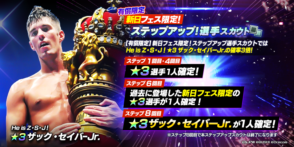 新日SSは2022年5月24日(火)9:00から実施しているメンテナンス終了後から、フェス限定新★3選手「[He is Z・S・J!]ザック・セイバーJr.」が初登場するフェス限定ステップアップ選手スカウトを開催。
