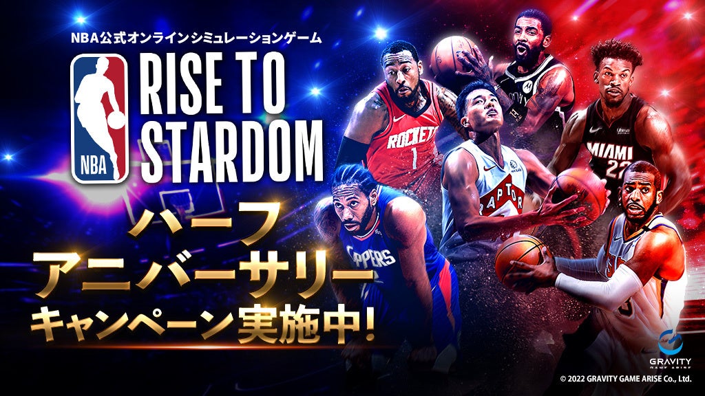 グラビティゲームアライズ株式会社(所在地:東京都中央区)は、日本国内開発、日本人に向けたNBA公式オンラインシミュレーションゲーム『NBA RISE TO STARDOM(NBAライズ)』において、ハーフアニバーサリーを記念したキャンペーンを実施いたします。