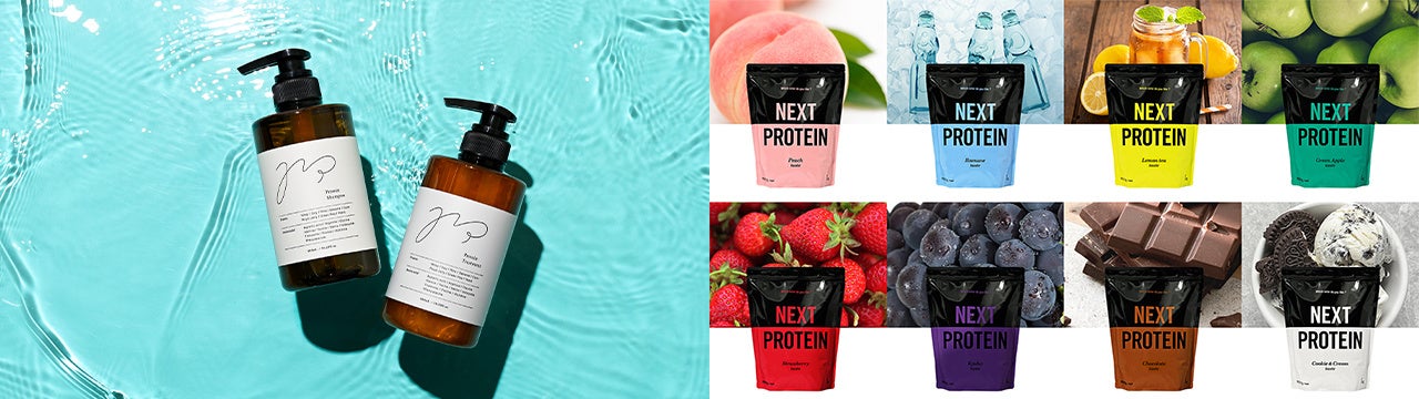 日常のダメージによって空洞化された髪にタンパク質が吸着する事で隙間を埋めて補強し、潤いとハリコシのある髪へと導くNEXT SHAMPOO(ネクストシャンプー)をはじめ、ラインナップは8種類の選べるフレーバーと、1回で約20.5gのホエイプロテインのたんぱく質を効率よく摂取することができ、水でも美味しく、溶けやすいを目指したプロテインです。