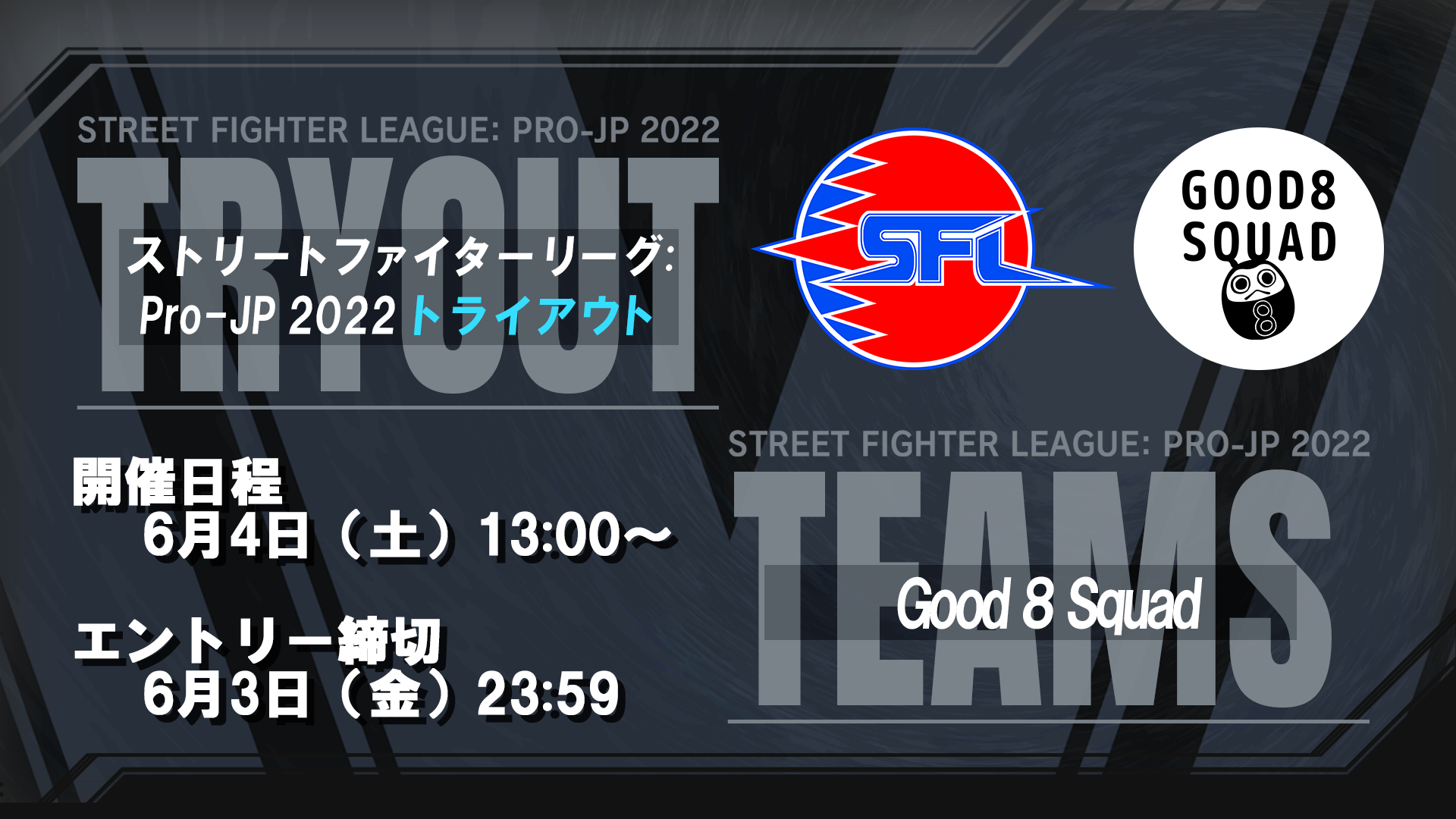 そして、昨シーズンの「ストリートファイターリーグ: Pro-JP 2021 グランドファイナル」準優勝の「Good 8 Squad」主催のトライアウト大会も、新たに開催が決定しました。