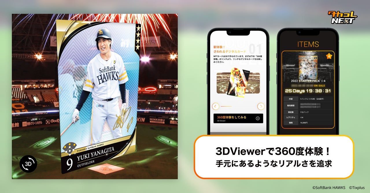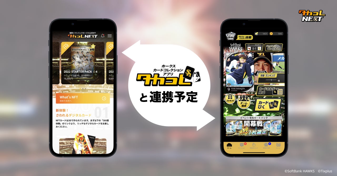 電子チケット事業やチケット二次販売「チケプラトレード」、視聴PASS販売プラットフォーム「StreamPass」を運営する株式会社Tixplus(本社:東京都渋谷区、代表取締役:池田 宗多朗)は、福岡ソフトバンクホークス株式会社と共同で、福岡ソフトバンクホークス初のオリジナルNFTサービスとして「タカコレNEXT」を2022年6月10日(金)から提供を開始します。「タカコレNEXT」は、福岡ソフトバンクホークスの選手肖像を活用した公式NFTコンテンツ販売サービスです。また、本日から6月30日(木)までの期間に、福岡ソフトバンクホークス公式LINEアカウントと友だち登録し、キャンペーンに応募された方を対象に、東浜投手のノーヒットノーラン記念デザインNFTカードをプレゼントするキャンペーンも実施します※。