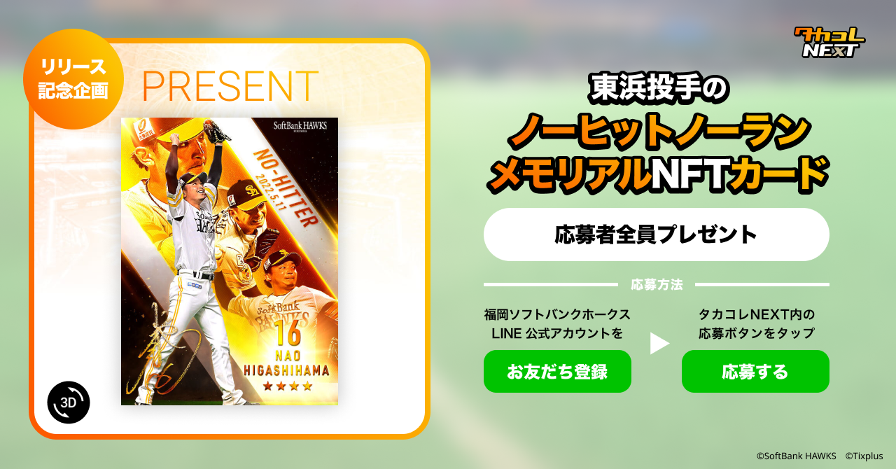 福岡ソフトバンクホークス公式LINEアカウントに友だち登録した上で、期間内にタカコレNEXTにて応募手続きが完了した方を対象に「ノーヒットノーラン達成記念NFTカード」をプレゼントいたします。記憶に新しい東浜投手の快挙を、シリアルナンバー付きの限定NFTとしてお楽しみいただけます。
