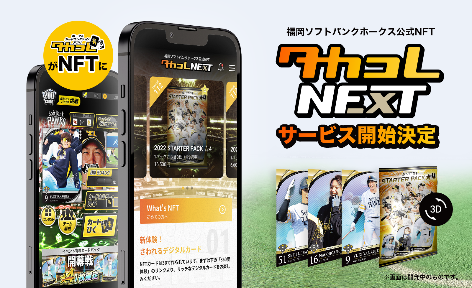 「タカコレNEXT」では、臨場感溢れる試合での写真のほか、公式サービスならではの貴重なショットを使ったNFTカードを展開する予定です。また、公式カードコレクションアプリ「ホークスカードコレクション・タカコレ」のデジタルカードもNFTとして「タカコレNEXT」で販売します。「ホークスカードコレクション・タカコレ」のカードが、NFTの技術によって実物のカードと同じように一枚一枚の価値を証明できるようになります。さらに、「ホークスカードコレクション・タカコレ」内でのカードを使った予想ゲームやマイチームの設定、タカコレホルダーとの連携なども予定しています。