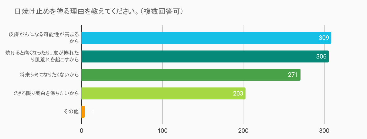 日焼け止めを塗る理由について、「皮膚がんになる可能性が高まるから」と「焼けると痛くなったり、皮が捲れたり肌荒れを起こすから」という回答が、全体の9割以上を占めています。