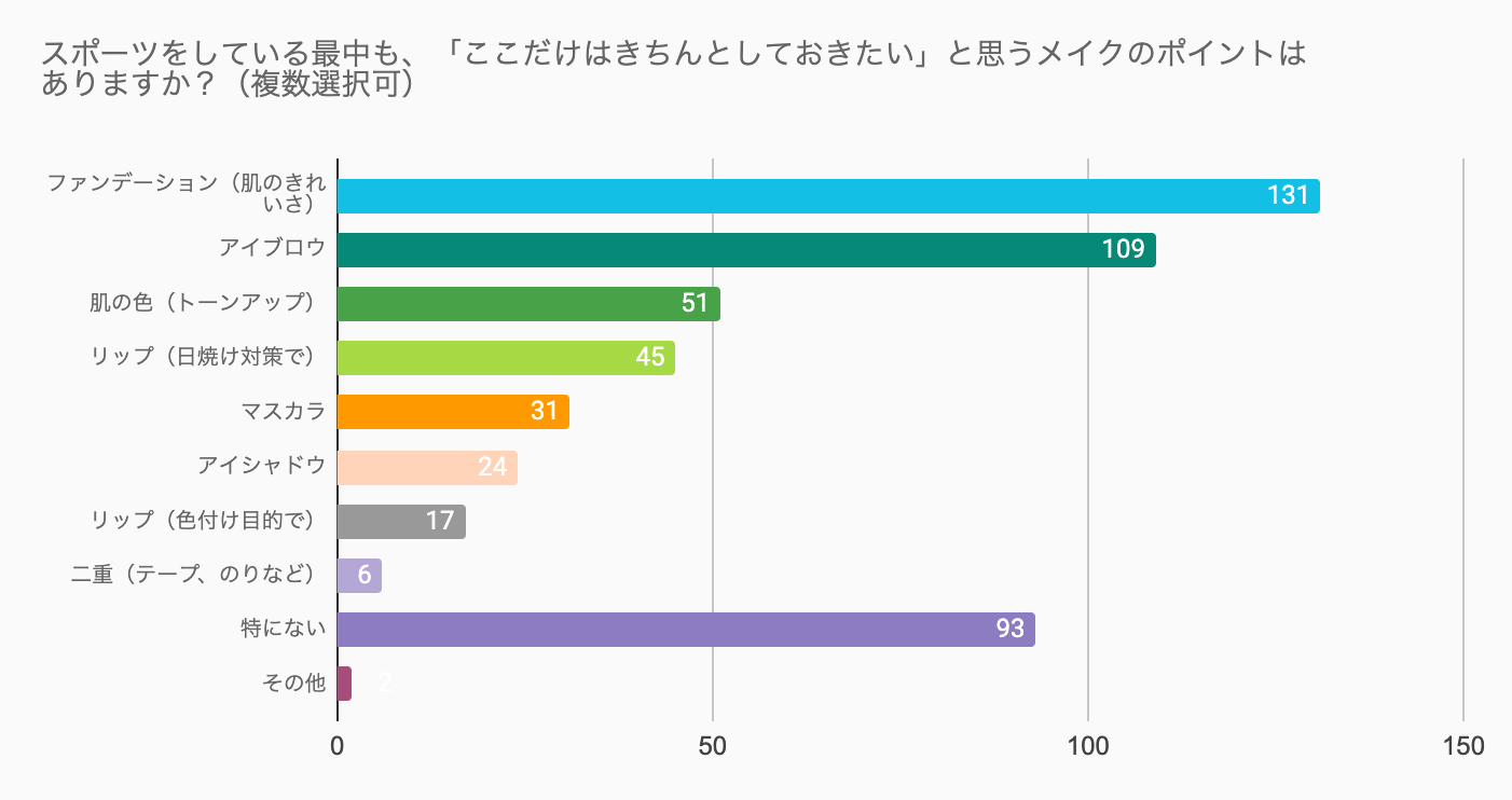 スポーツをする際のメイクでこだわりのある点について、肌のきれいさが最も気になるという結果に。肌のトーンにこだわるという人が3番目に多いことからも、肌に意識を向けている人は多いと言えます。