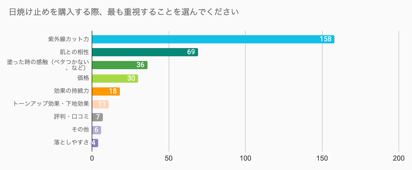 外での活動時間が長いスポーツ女子からは、紫外線カット力が最重要視されていました。しかし肌との相性や塗った時の感触も、注目されているポイントであることが分かりました。