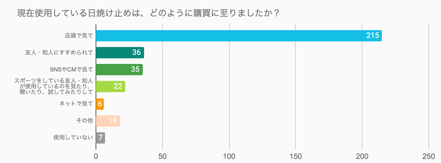日焼け止めの購入経路としては、店頭で見て決めた人が全体の6割以上。一方店頭施策やSNS・CM施策に加えて、知人や友人の勧めで購入に至る場合も多くあることがわかりました。