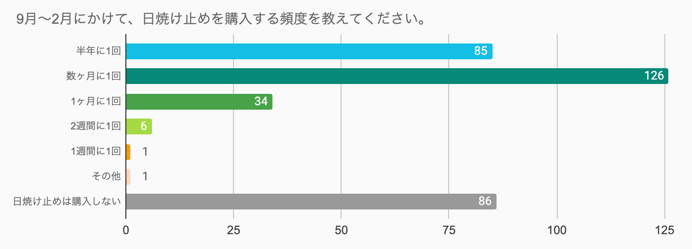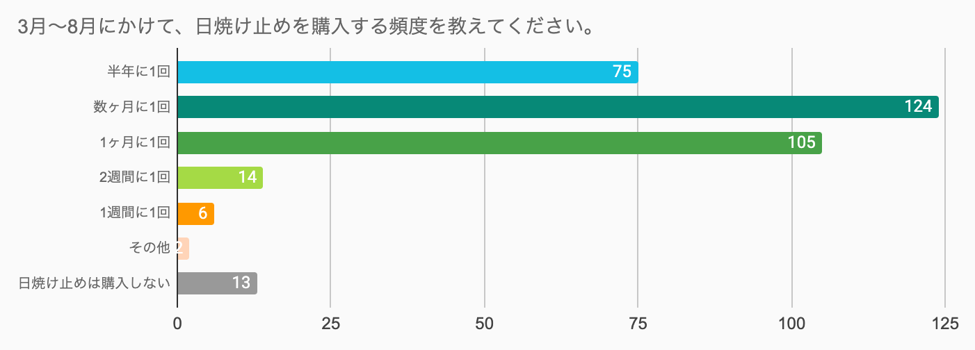 - 日焼け止めの購入頻度は、春から夏にかけての方が高い。特に「1ヶ月に1回」の頻度で購入する人は339人中105人。