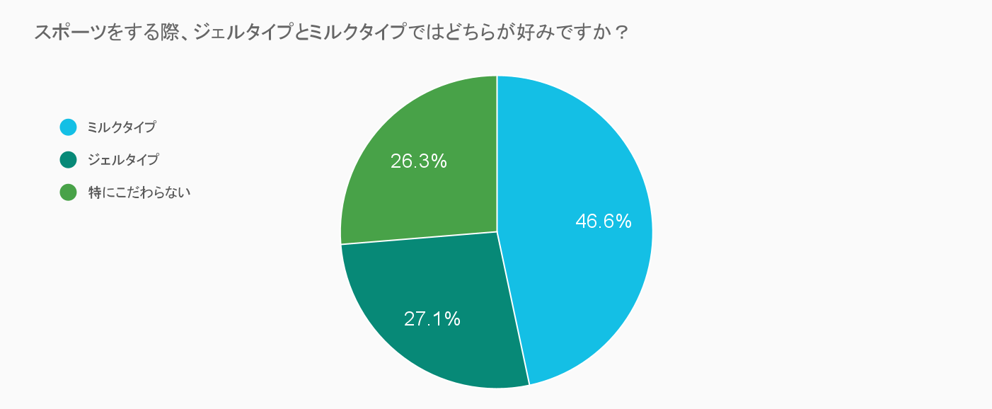 - スポーツ中はミルクタイプの日焼け止めを好む人が46%で最も多い。