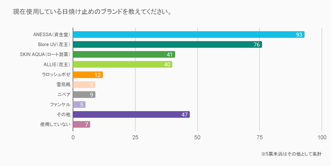 日焼け止めのブランドでは、ANESSA(資生堂)が最も多く使用されていることが分かりました。続いてBiore UV(花王)が2番目に多く、次にSKIN AQUA(ロート製薬)、ALLIE(花王)が並ぶ結果に。