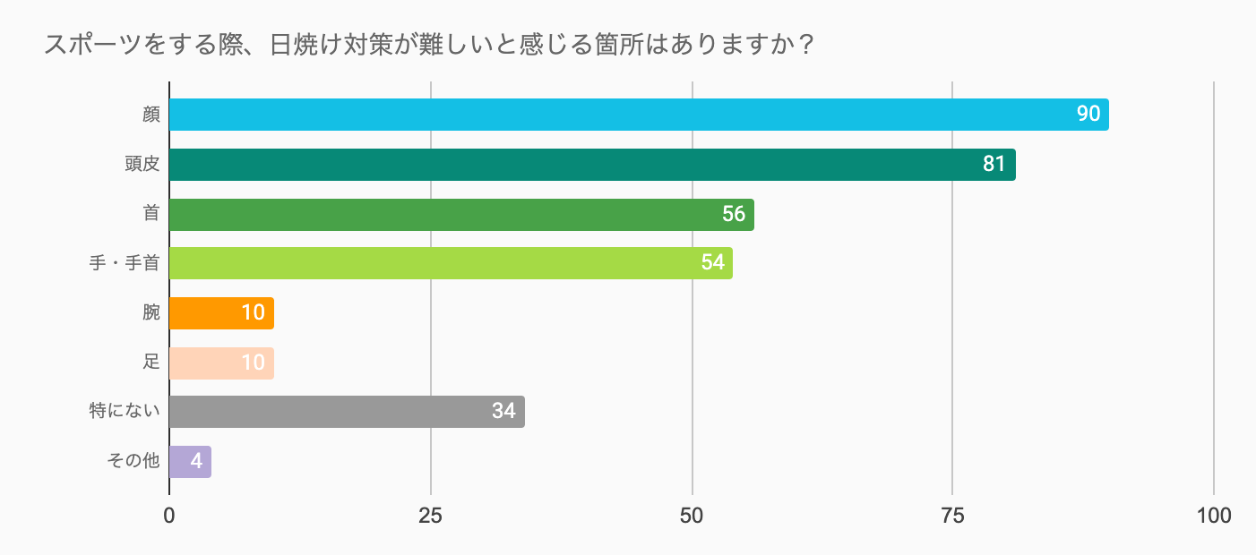 日焼け対策が難しいと感じる部位については、顔が最も多く、続いて頭皮という結果に。難しいと感じる理由を尋ねると、顔は汗をかきやすいため日焼け止めが落ちやすいこと、頭皮は日焼け止めを塗れないため日焼けを防げないことが多く挙げられていました。