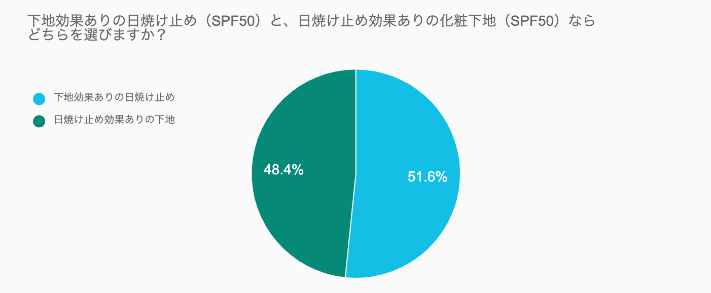 化粧下地としての効果がある日焼け止めと、日焼け止め効果のある化粧下地のどちらが良いかという問いに対しては、約半数ずつ回答が分かれました。