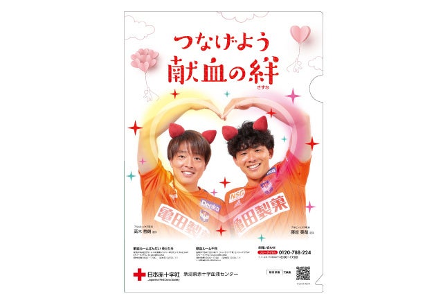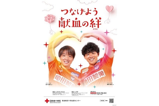 このたび、新潟県赤十字血液センターが献血啓発PRで用いるポスター・クリアファイルのモデルとして、当クラブ所属の高木善朗選手、藤原奏哉選手が起用されましたので、お知らせいたします。