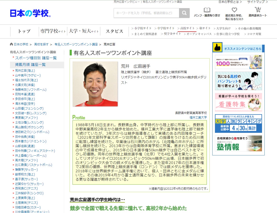 全国の大学・短大・専門学校などの学校情報を提供する株式会社JSコーポレーション(本社:大阪市北区 代表取締役社長:米田英一)は、有名人スポーツワンポイント講座「競歩 荒井広宙選手」についての記事を公開しました。