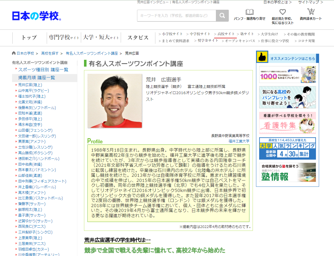 全国の大学・短大・専門学校などの学校情報を提供する株式会社JSコーポレーション(本社:大阪市北区 代表取締役社長:米田英一)は、有名人スポーツワンポイント講座「競歩 荒井広宙選手」についての記事を公開しました。