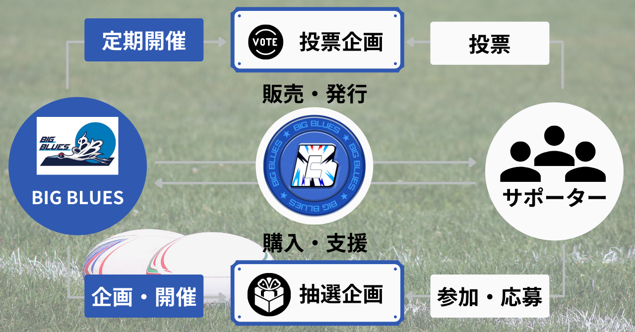 日本ラグビー界では初となるトークン発行型コミュニティで、皆様と一緒に魅力あるクラブにしていければと考えております。試合に勝つこと、ラグビーを通して社会に恩返しをすること、この両輪を前に進める事が新生BIG BLUESとなります。