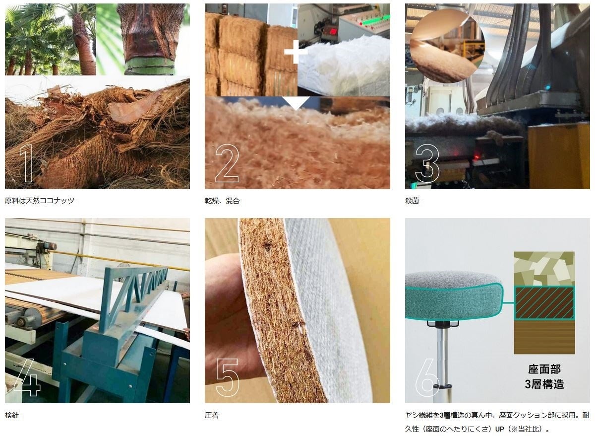 「ル・プリエスクワット」は、耐久性をアップさせるため、座面の中間層にヤシ繊維を採用しています。ヤシ繊維は、今までココナッツ飲料の製造時に廃棄されていたものを再利用しており、従来の「ル・プリエスクワット」で使用していたウレタン素材をヤシ繊維に変えることで、適度な硬さがうまれ、座面の耐久性がアップしました。また、資源を再利用することで製品へのプラスチック使用量も減らすことができ、地球環境に配慮したサステナブル商品としてリニューアルしました。