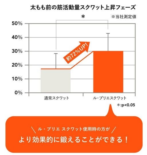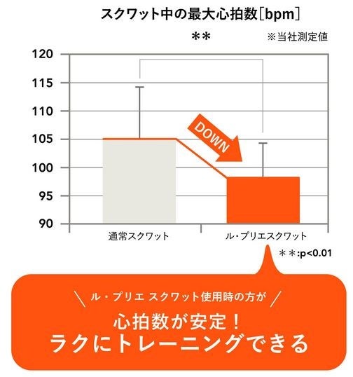 「ル・プリエスクワット」の脚部には、座位での上下運動をサポートするガスシリンダーを採用しています。ガスシリンダーのサポート力により、身体的な負荷を低減しながらも効率的にトレーニングすることができます。通常のスクワット運動と比べ、太もも前(大腿直筋)の筋活動量が約72%アップ※3します。また最大心拍数は、通常のスクワット運動と比べ安定するためラクをしながら効率的にトレーニングができます。