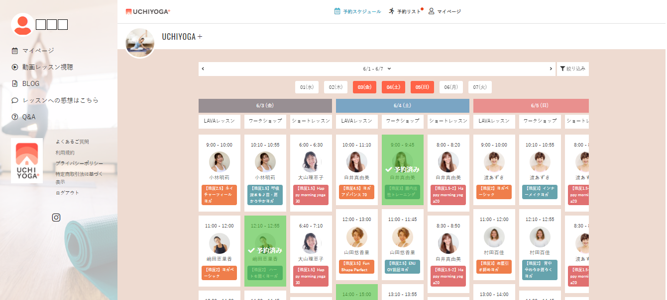操作性と利便性の向上をはかり、サイトをご利用いただくお客様からの声を反映し、サイトぺージを刷新しました。新サイトでは、その日に開催しているレッスンが一目でチェックでき、予約や受講もスムーズです。旧サービス「うちヨガ+」では必要となっていた、受講時の各レッスンID・パスワードの入力も不要となり、マイページよりワンクリックで、レッスンに入室できます。