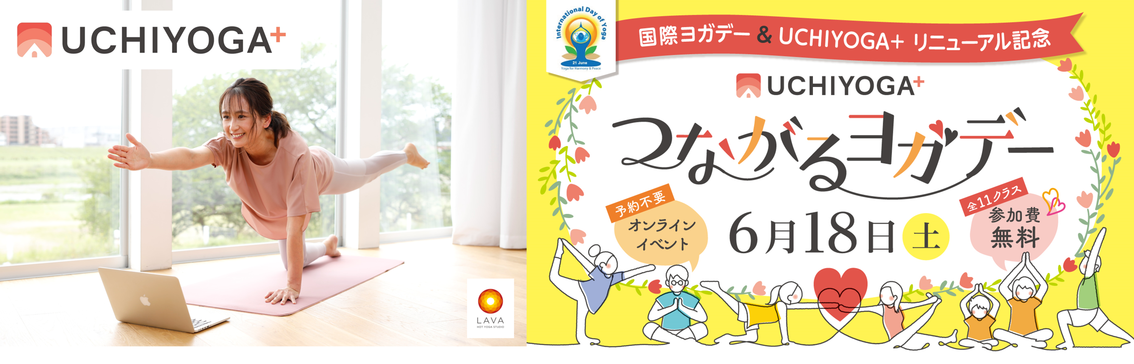 「ヨガを通して、ひとりでも多くの人を幸せに」という企業理念を掲げ、全国に450店舗以上のホットヨガスタジオLAVAを展開する株式会社LAVA International(本社:東京都港区/代表取締役:鷲見貴彦/以下:LAVA)は、オンラインヨガサービス「うちヨガ+」をサービスリニューアルし、新名称「UCHIYOGA+」として6月1日(水)より提供開始します。また、6月21日の「国際ヨガデー」および、「UCHIYOGA+」の提供開始を記念し、ヨガのオンラインレッスンが、1日何回でも無料で楽しめる『UCHIYOGA+ つながるヨガデー』を、6月18日(土)に開催します。