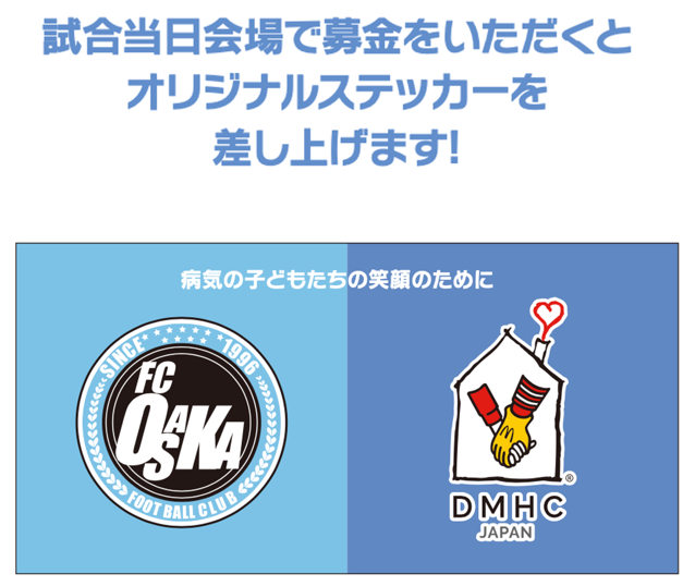 また、試合会場場外イベントスペースにおいて、DMH支援のための募金活動を実施し、募金ブースで300円以上募金いただくと、「スマイルソックス」とFC大阪オリジナルステッカーをお配りいたします。