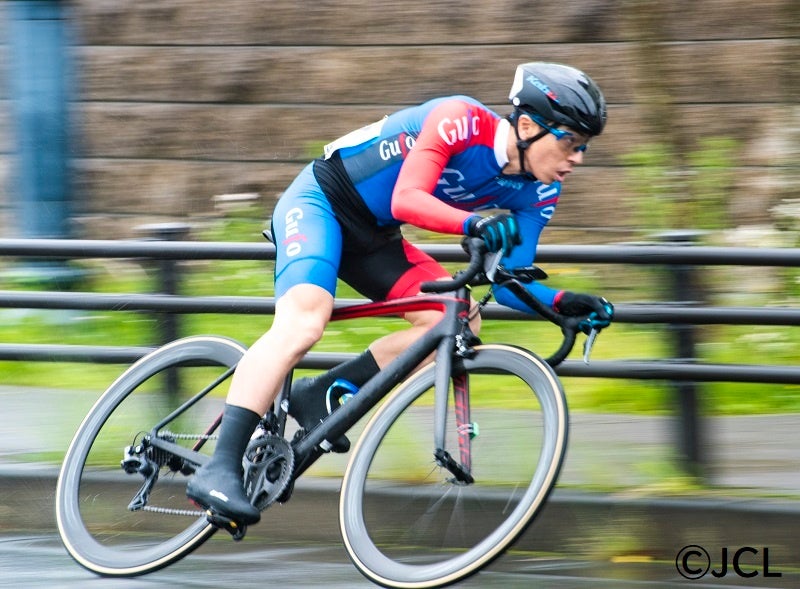 あみプレミアム・アウトレット敷地、1周1キロのコースを、所定の規格のロードレース自転車で周回する「あみプレミアム・アウトレットJCLクリテリウム」には、全3クラス総勢45名、10代から50代までの幅広い層のホビーレーサーが出場しました。前日からの激しい雨風が開始直前まで続く中、出場者は悪天候をものともせず、意気揚々とレースに臨みました。ギャラリーのすぐ目の前を疾走するレースは、走行音が静かな反面、選手の息遣いが聞こえ、臨場感たっぷりで迫力があり、観客もハラハラしながらも楽しめるものでした。