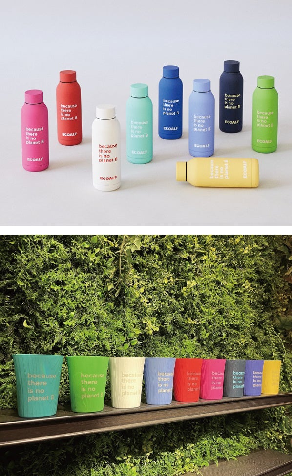 「地球環境を守るために服をつくる」をコンセプトに、すべてのアイテムを再生素材や環境負荷の低い天然素材のみで製造・販売するサステナブルファッションブランド「ECOALF」のボトルとタンブラーです。