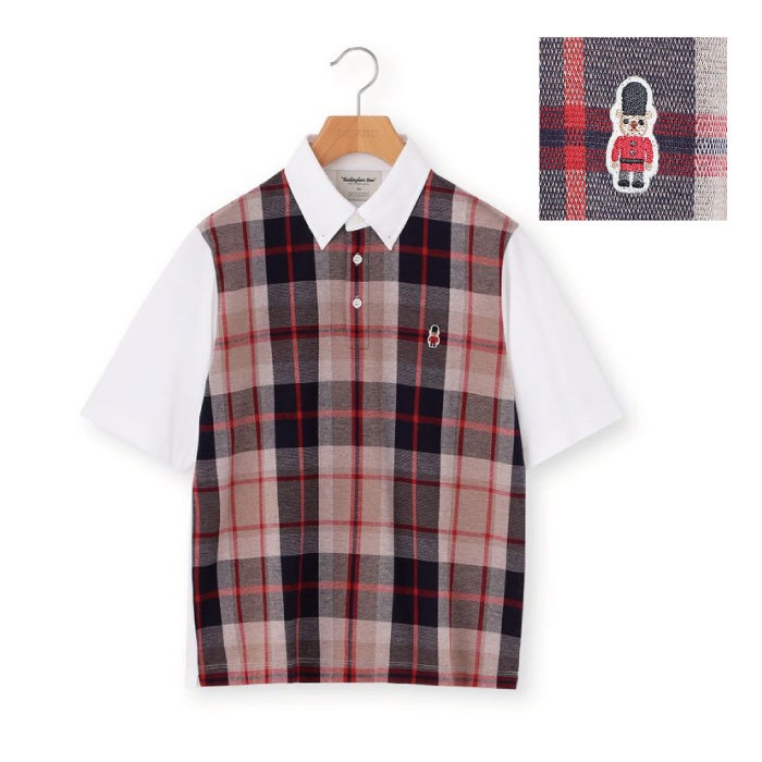 ハウスチェックが映えるポロシャツ。マスコットキャラクターの「バッキンガムベア」がチャーミングなアクセントに。