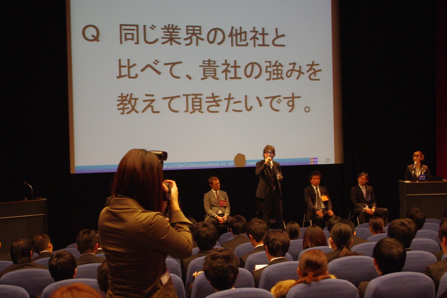 説明会の終盤では各事業部の社員が学生からの質問にお答えします。質問をする学生と、舞台上でそれに答える社員の姿はまるで映画の完成披露試写会のような雰囲気になります。