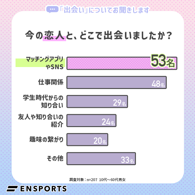 男女500名へのアンケート調査において「現在恋人がいる」と回答した207名の中で「マッチングアプリやSNSで出会った」と答えた方が最多に。社会人におすすめの出会いの場とは?(https://www.ensports.com/magazine/meeting-place)