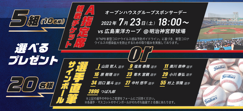 株式会社オープンハウスグループ(本社 東京都千代田区、代表取締役社長 荒井正昭、以下「当社」)のグループ会社である株式会社オープンハウス・ディベロップメント(以下「オープンハウス・ディベロップメント」)は、明日6月4日(土)より、当社がトップスポンサーを務めるプロ野球チーム 東京ヤクルトスワローズ(以下「スワローズ」)の観戦チケットなどが当たるプレゼントキャンペーンを開催いたします。