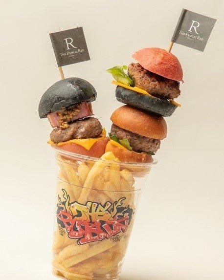ジューシーなハンバーグをオリジナルバンズで挟んだミニサイズのハンバーガー(スライダー)3個とフライドポテト。ハンディで持ち歩いてもシェアしてもGood。
