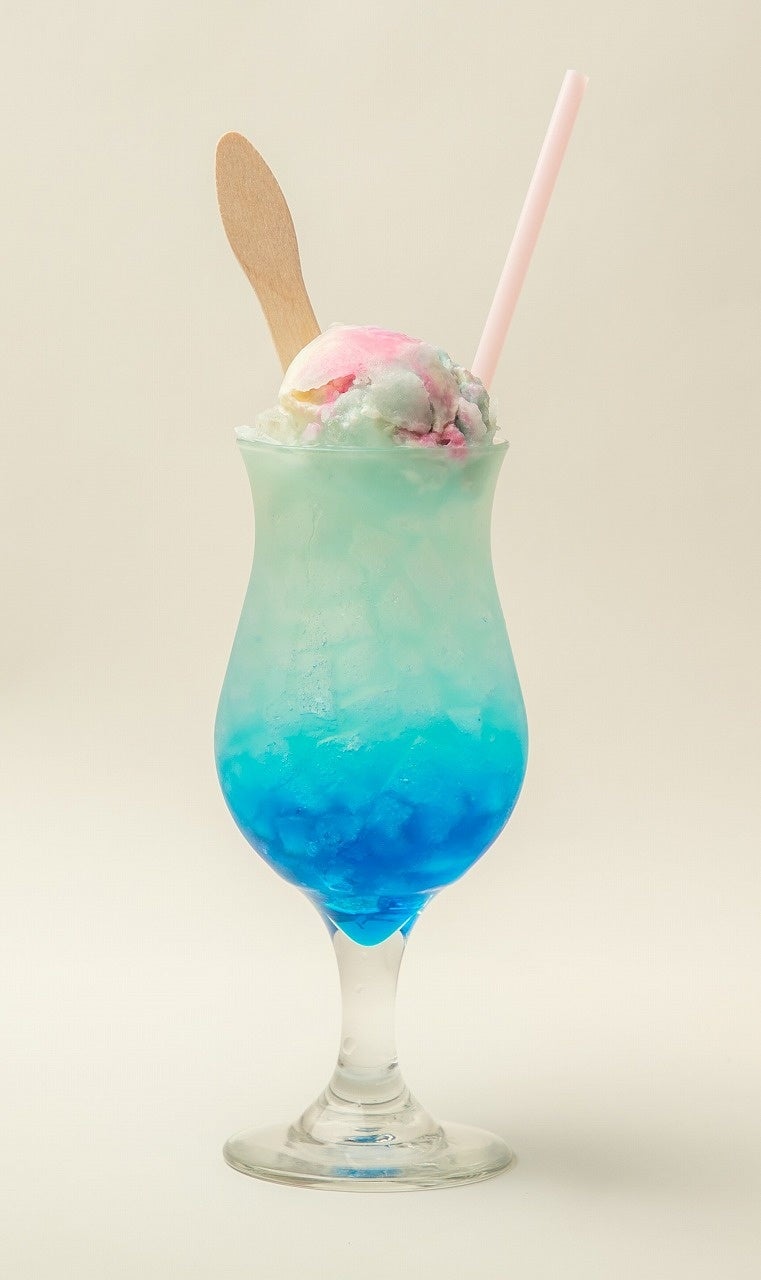 甘酸っぱいレモネードのクリームソーダ。ステージ予感させるブルーライトなレモネードにパステルカラーが鮮やかに混じりあうダンサブルなアイスをトッピング。