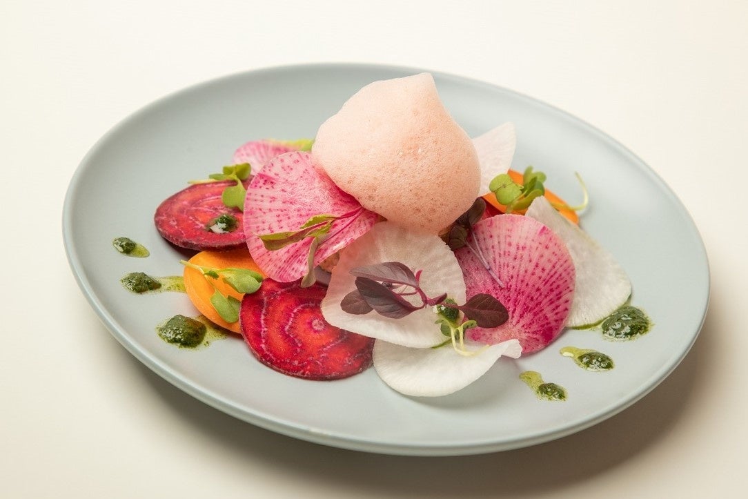 色々なダンススタイルが混じり合い性別も人種も越えたダンスのダイバーシティをイメージしたカラフルな見た目に、蟹を合わせたしっとりのタルタルポテトとカラフルでフレッシュな根菜の食感、ビーツとレモンの泡とバジルの2種の異なるソースで変化する『NEW STANDARD』サラダ