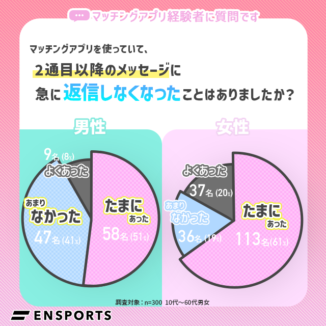 「2通目以降のメッセージに返信しなくなったことはありましたか?」という質問に対し、「たまにあった」「よくあった」と回答した方は全体の72.3%に上りました。マッチングアプリにおける2通目のメッセージの重要性とは?(https://www.ensports.com/magazine/matching-app-2nd-message)