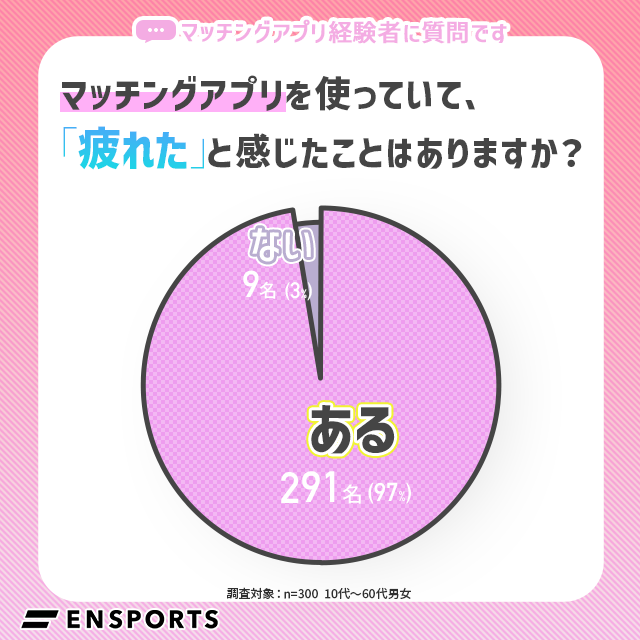 「マッチングアプリを使っていて疲れたことはありますか?」という質問に対し「ある」と回答した方は全体の97%にも上りました。マッチングアプリアプリ疲れの原因と対策とは? (https://www.ensports.com/magazine/matching-app-tired)