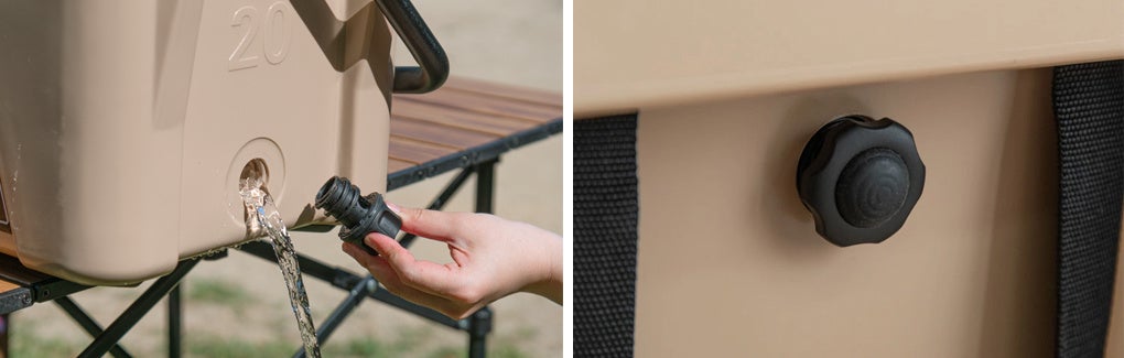 またクーラーボックスの内部に溜まった水を簡単に流すことができる“水抜き栓”や、気圧の変化によって、ふたが開かなくなる現象を防ぐための“気圧ダイヤル”をボディに備えております。