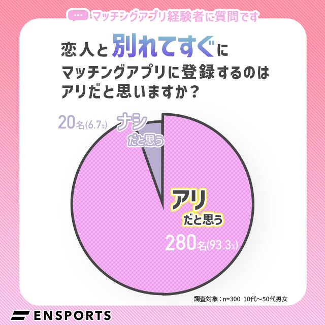 調査の中では「別れてすぐマッチングアプリに登録するのはアリ」と答えた方が全体の93.3%にも上る結果に。別れてすぐマッチングアプリを利用するメリットとは? (https://www.ensports.com/magazine/matching-app-immediately-after-parting)
