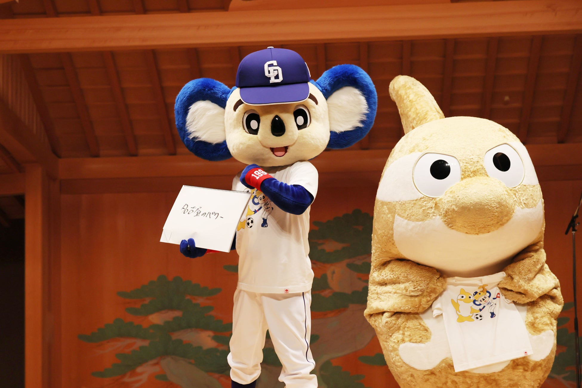 本発表会では、名古屋グランパス公式マスコットのグランパスくんと、中日ドラゴンズ公式マスコットのドアラが、「大名古屋展2022」の応援団として、名古屋能楽堂の舞台に登場。グランパスくんとドアラがプリントされた「『なごやだいすき』グランパスくん×ドアラTシャツ」をPRした金鯱グランパスくんは「キッズサイズも展開されているところがポイント」とコメント。さらに、ドアラは、「名古屋のパワーをぎゅっと詰め込んでいます」とスケッチブックで回答し会場を盛り上げました。