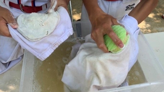 京都府八幡市で活動している野球チームのポンズジュニアさんにお伺いしました。三つ葉ブラザーズよりユニフォーム洗いのレクチャー後、実際にコーチと子どもたちにも洗濯していただきました。指導に関してコーチからは「礼儀を大切にしている」とお話しいただき、洗濯をした子どもたちからは「お~!」「すげー!」と汚れ落ちに驚きの声が上がりました。