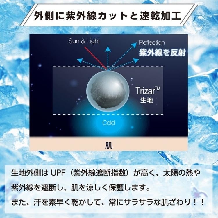 生地外側は紫外線カットと速乾加工により、太陽の熱や紫外線を素早く遮断し、インナー内を快適な温度に保ちます。また吸湿速乾に優れており、汗を素早く放出し、汗ばむ季節でも1日中サラサラな着心地をキープします。