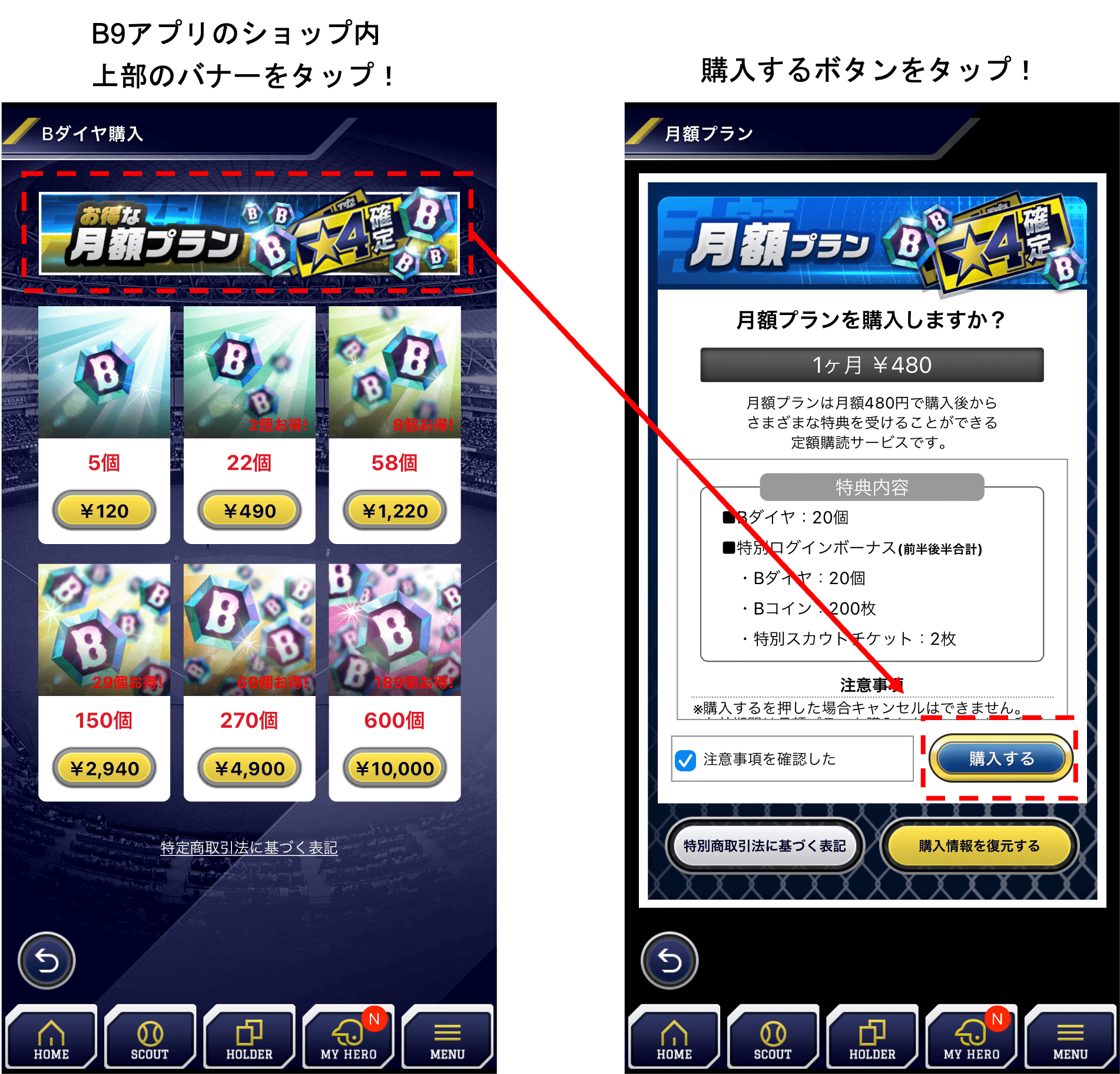 月額480円でBダイヤ20個に加え、ログインボーナス増量や月額プラン加入のお客様限定で開催されるキャンペーンにご応募いただけます。大変お得なプランですので、B9をよく使うバファローズファンの皆様におすすめのプランです。