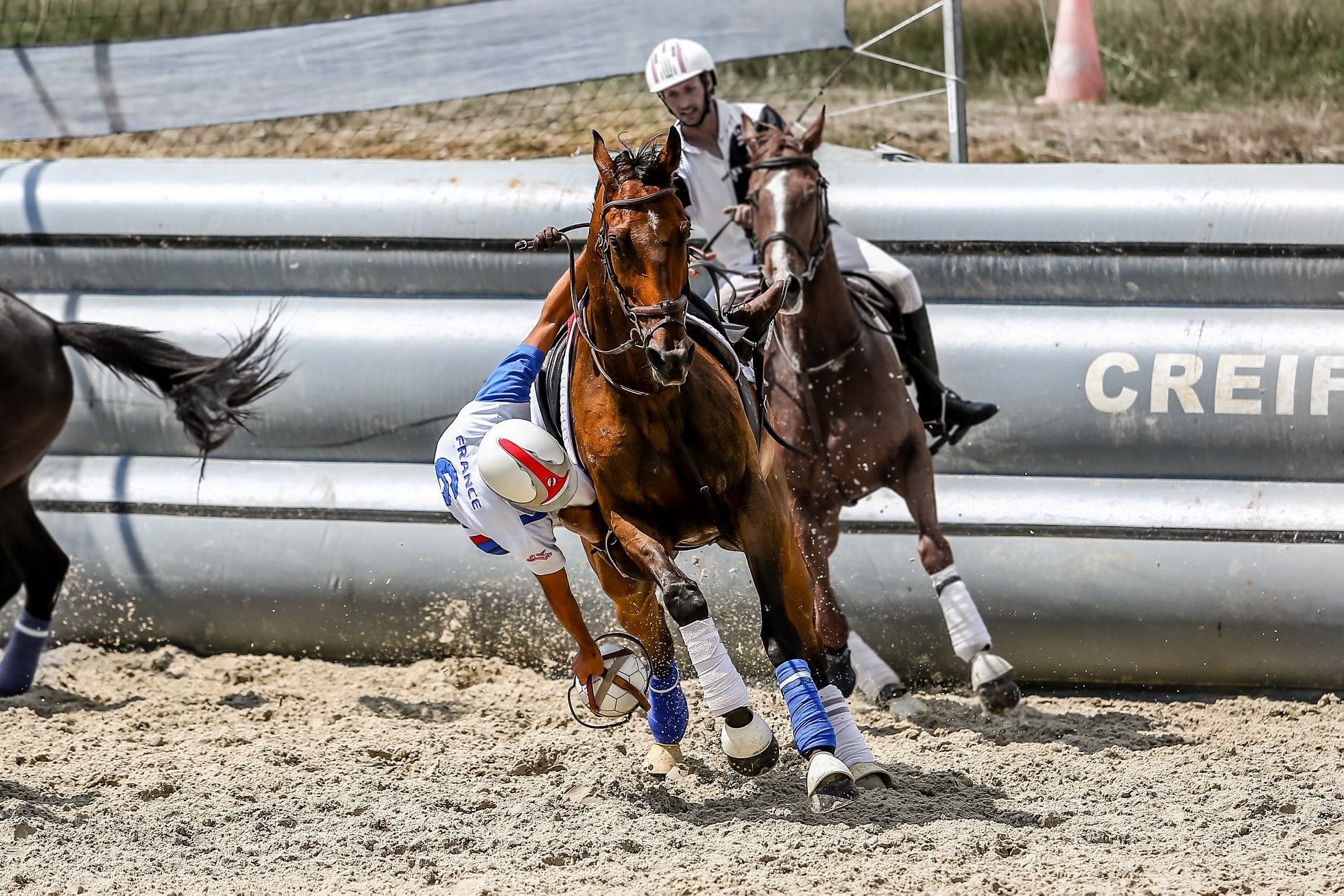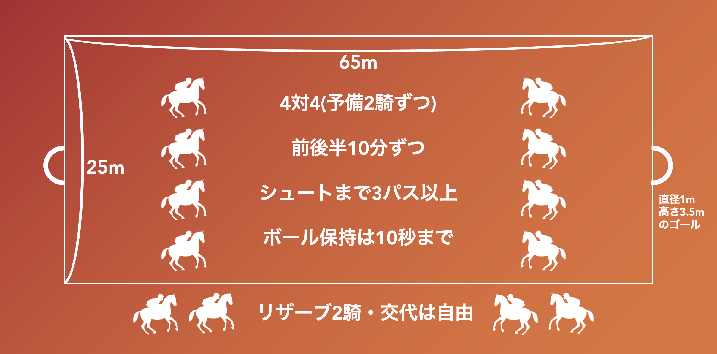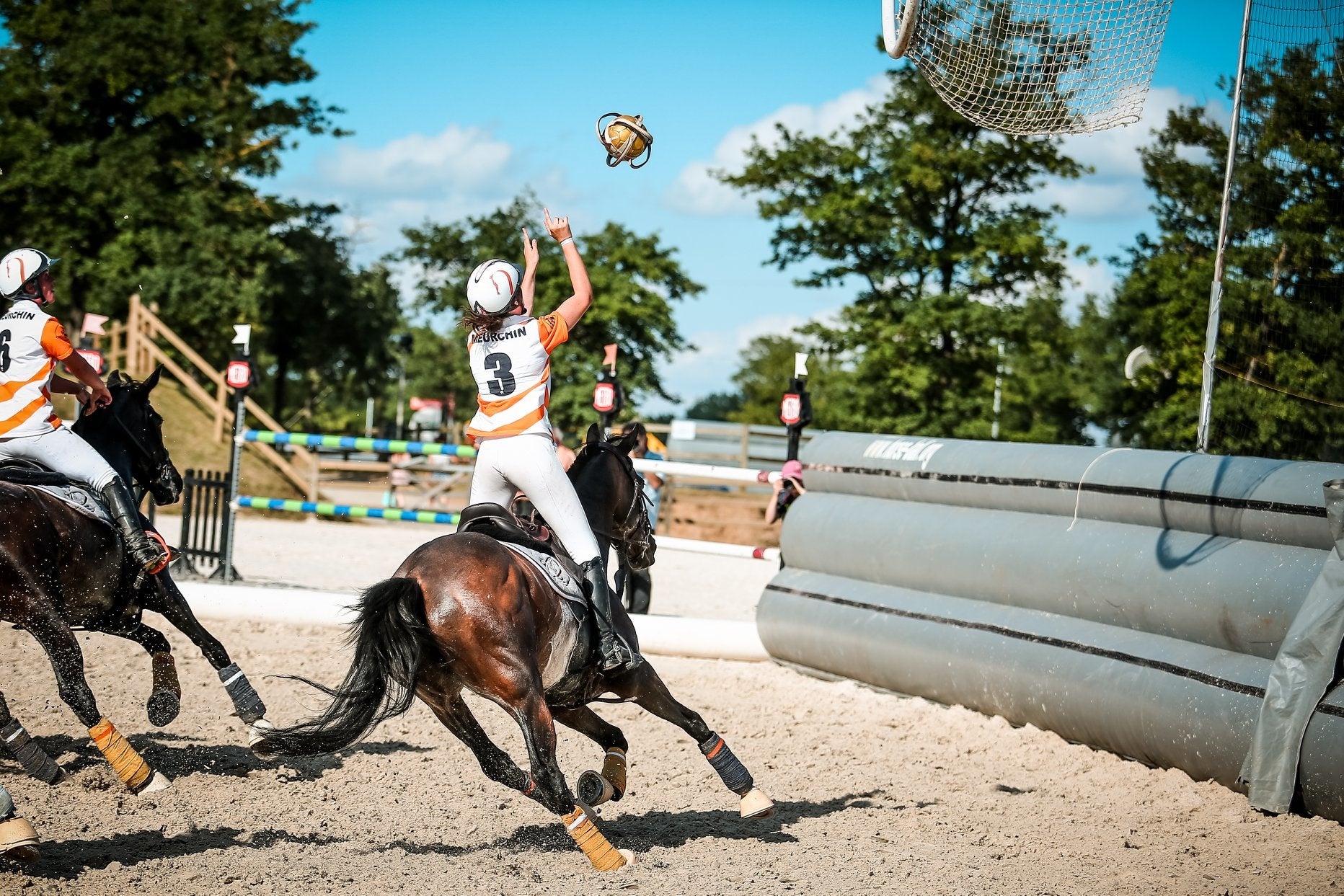 歴史的にはアルゼンチンの国技のパトから派生したもので、フランスで現在の競技の形になり、現在は欧米を中心に世界28カ国、競技人口約50,000人に楽しまれております。ほとんどの球技と同じく、より多くの点を取ることを目的に、4騎対4騎で馬に乗ったまま、皮の取っ手のついた特殊なボールを扱いながら、ドリブル・パス・タックル・シュートをしてゴールを目指すのが基本的なルールになります。