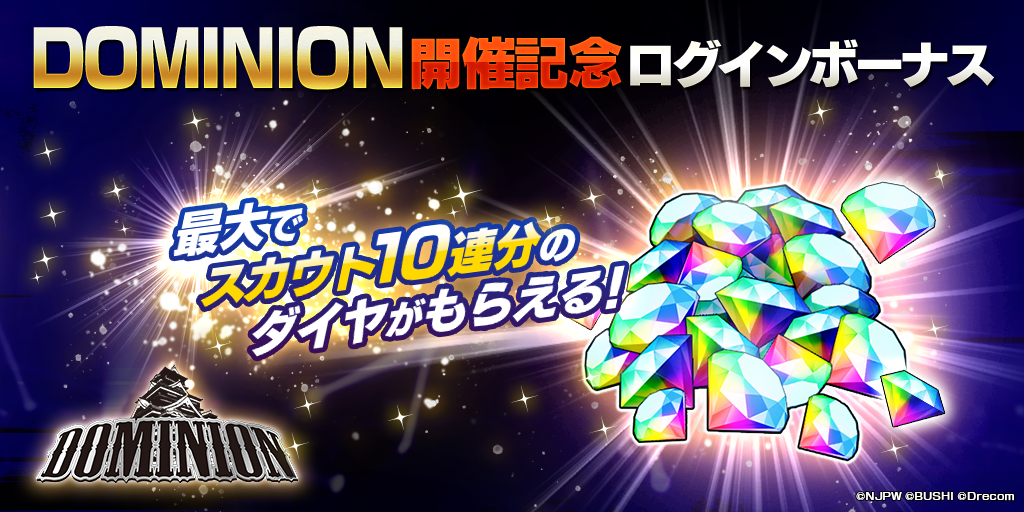 - 累計1,500ダイヤ(10連スカウト1回分)が獲得できる「DOMINION開催記念ログインボーナス」が開催中!