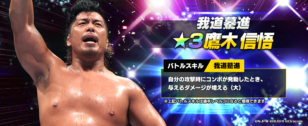 さらに、新★3選手「[我道驀進]鷹木信悟」がピックアップ選手としてステップアップ回数に関わらず、スカウト確率が通常の2倍かつ獲得時のピース量が増量となっております。