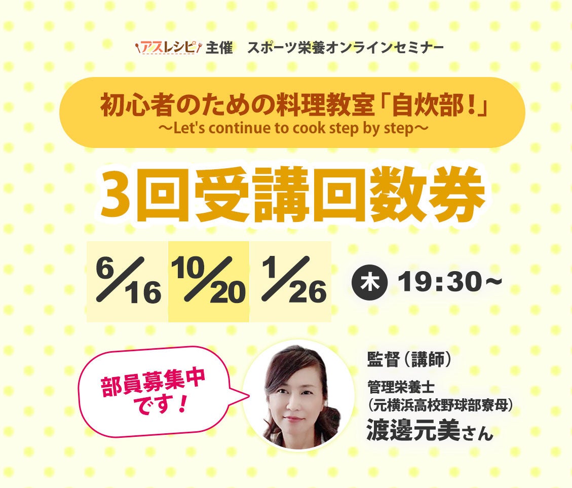 6月16日の第1回は、「1回の準備で夕飯と翌朝のメニューを作る」をメインテーマに、栄養価の観点からの野菜の選び方、物価高の中での節約食材の選び方、調理手順や料理を継続させるポイントのほか、身体を作るために必要なタンパク質の量、それをとるための食材の量などを学びます。1人暮らしの自炊アスリート、実は料理が苦手という保護者の方だけでなく、百戦錬磨のベテラン主婦も「もっと早く知っておけばよかった」と感心すること間違いなしの「目からウロコ」情報が満載です。