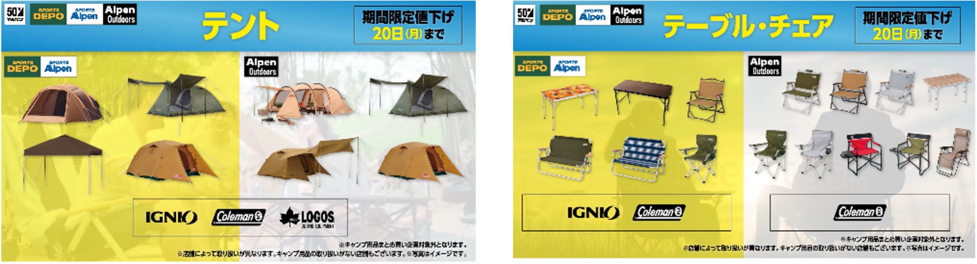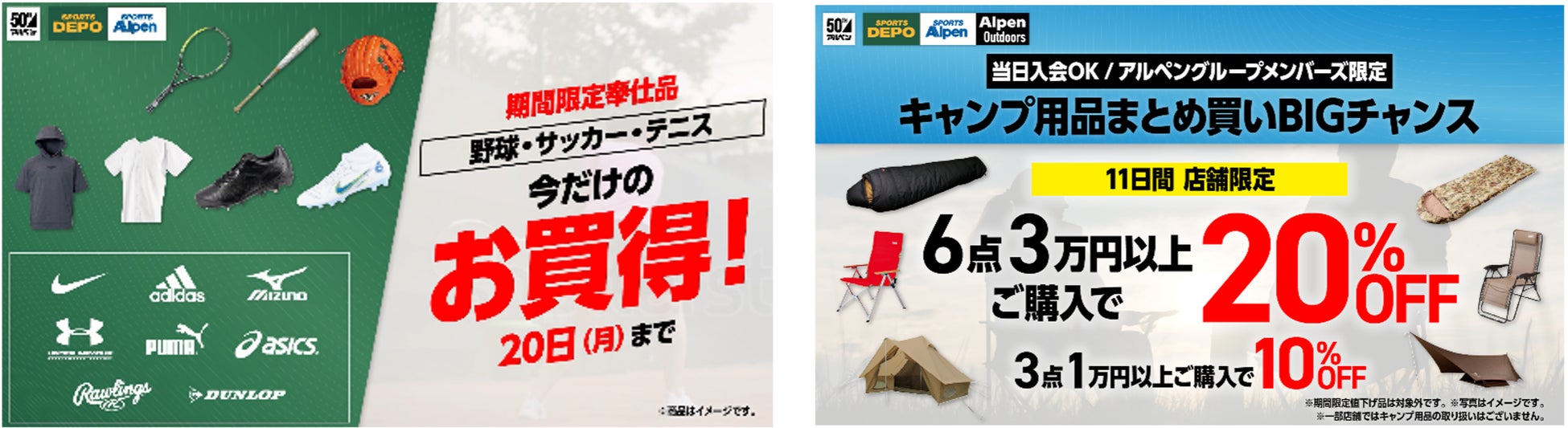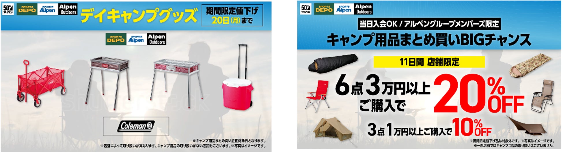 ・店舗限定、アルペングループメンバーズ限定、キャンプ用品まとめ買いBIGチャンス!