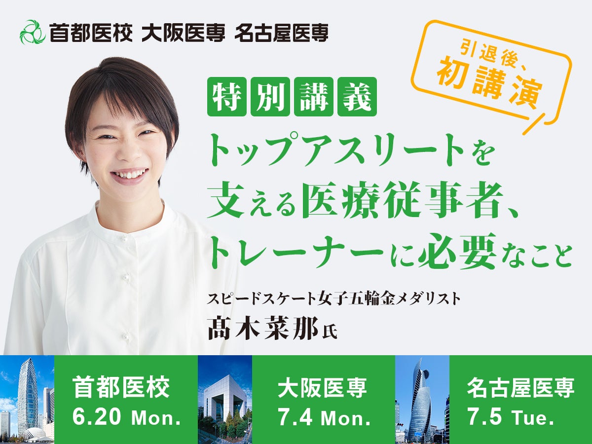 医療・福祉・スポーツ業界の各分野で活躍する医療人を育成する専門学校 首都医校(東京都)、大阪医専(大阪府)、名古屋医専(愛知県)は、五輪2大会で金メダル2つ、銀メダル1つを獲得したスピードスケート選手、髙木菜那氏をお招きし、特別講義を開催します。