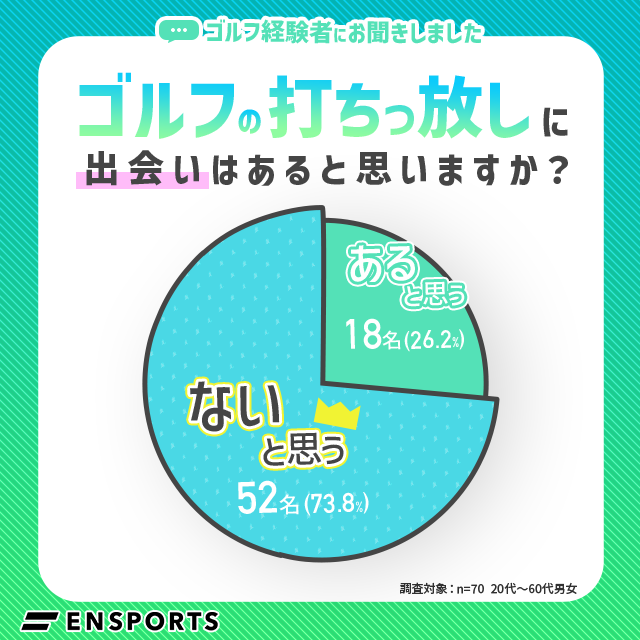 調査の結果「ゴルフの打ちっぱなしには出会いがないと思う」と答えたゴルフ経験者は全体の70%以上に。ゴルフの打ちっぱなしと出会いの実態とは?(https://www.ensports.com/magazine/meet-at-a-golf-competition)